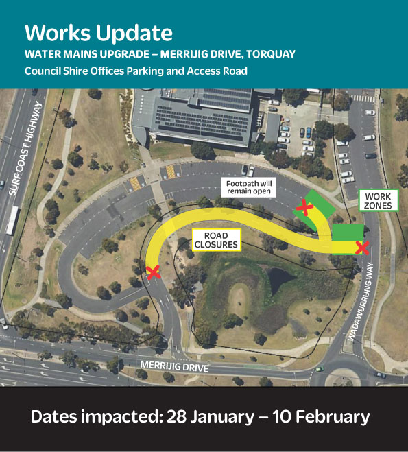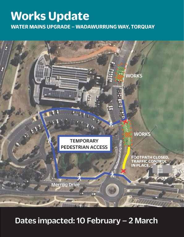 The second phase of the mains work will take place from 10 February - 2 March and will impact traffic and parking along Wadawurrung Way. Traffic control will be in place 7am to 5pm Monday to Friday. There will be temporary closures of the footpath and some parking spaces.
