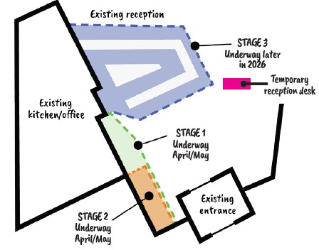 desk and kiosk. This work is still being planned. A temporary reception desk will be in place