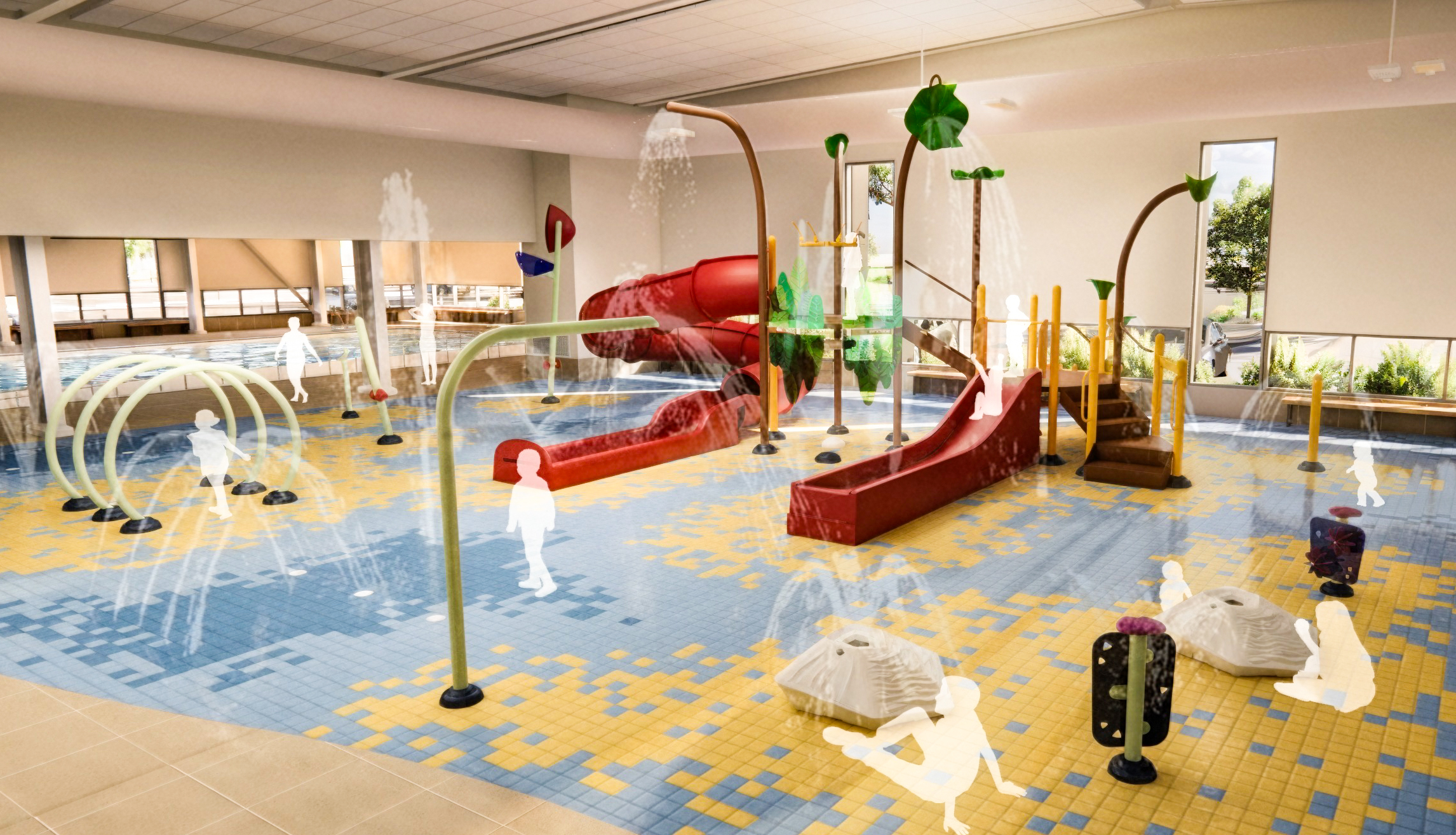 The indoor splash park will feature two slides, various water fountains and jets, and accessible play zones designed for young children of all abilities.