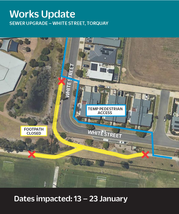 To allow for sewer works, a section of the path on the southern side of White Street near Surf Coast Secondary College will be temporarily closed from 13 -23 January. The footpath on the northern side of White Street will remain open.
